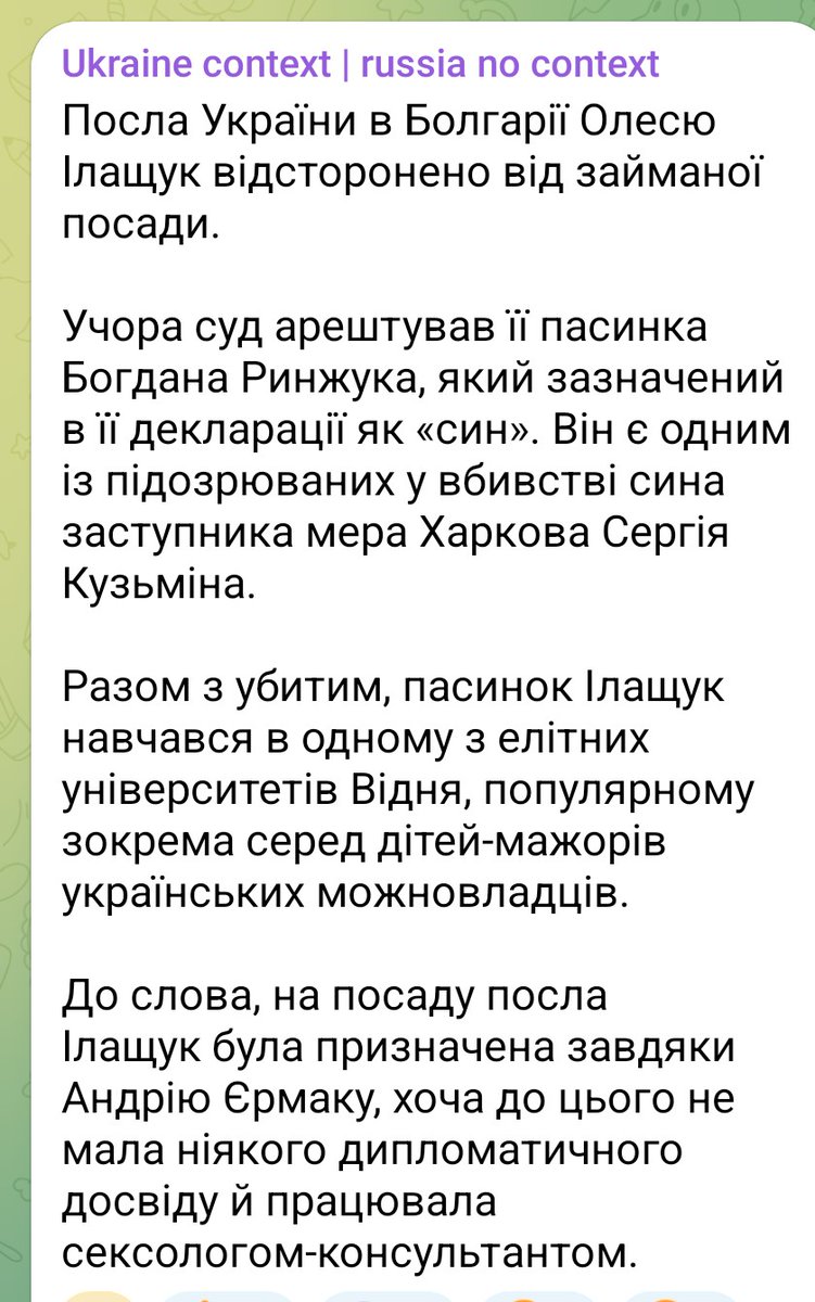 Рынжук, по данным СМИ, является пасынком посла Украины в Болгарии Олеси Илащук.