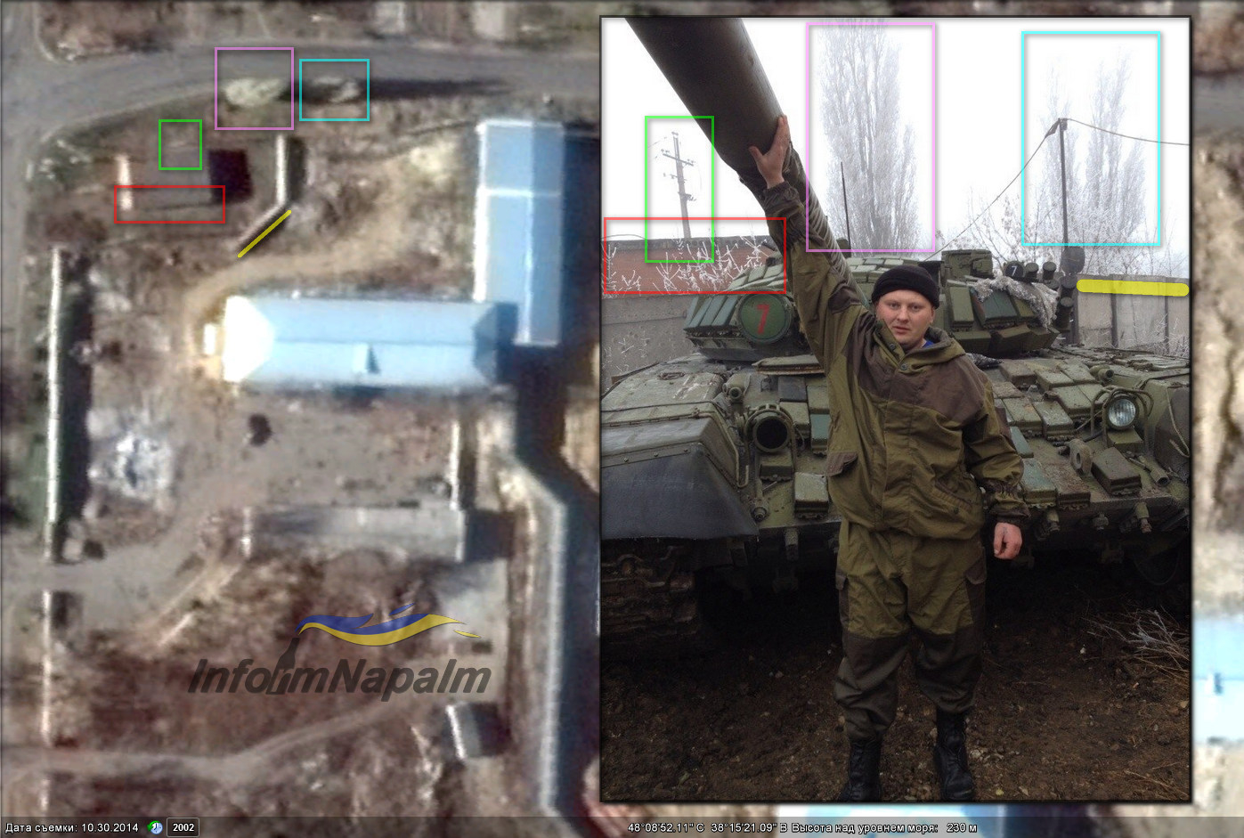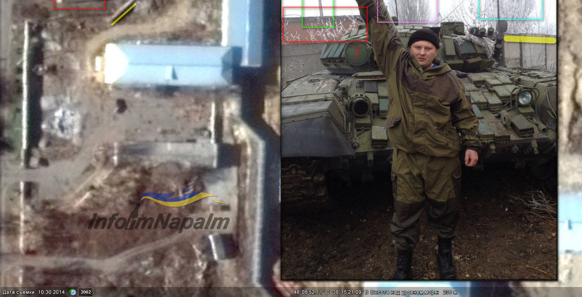 Международным волонтерским сообществом InformNapalm было идентифицировано точное место припрятанного за углом здания бывшего Ждановского городского отдела Управления МВД в Донецкой области танка оккупационных войск России.