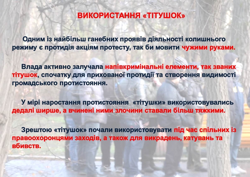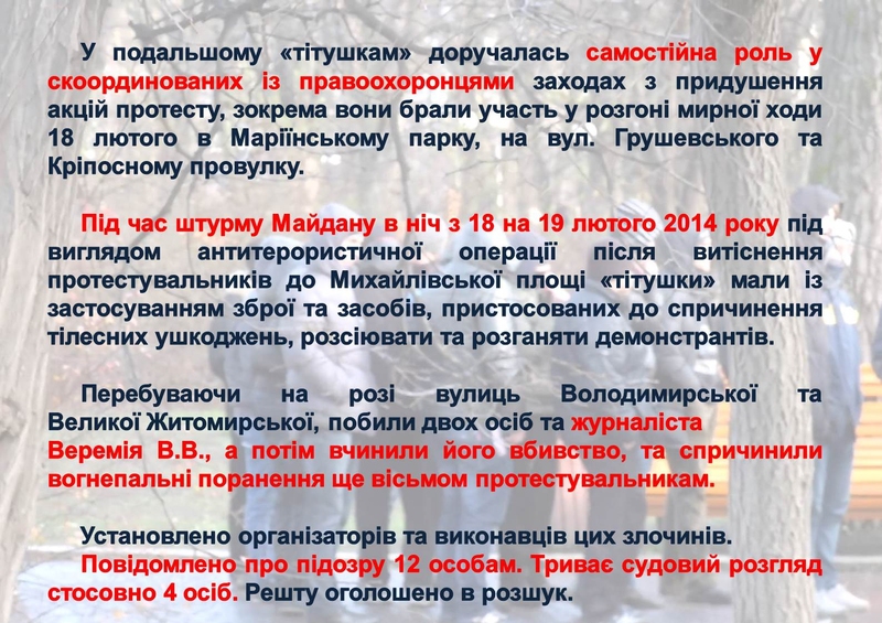 Угрупування тітушок, що працювали проти Майдану не розгромлені. Жоден працівник управління оперативної служби, що приймав участь у організації нападів на майданівців не притягнений до відповідальності. Слідчий Роман Козлов, в якого в 2013-му році висів російський прапор в кабінеті, садив майданівців у СІЗО, проходить атестацію в поліцію.