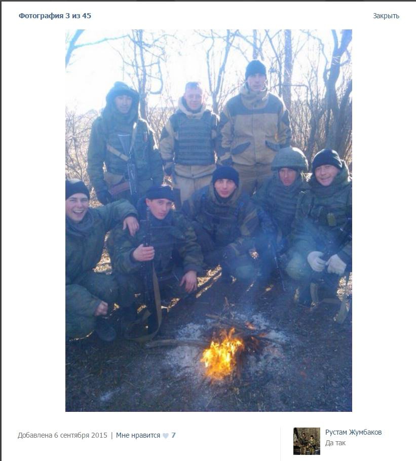 1. Самый интересный момент - фото (архив), загруженное в ноябре 2014 года, на котором Жумбаков с сослуживцами позируют на фоне временного полевого стойбища подразделения и техники в зоне конфликта. Подпись к фото: "Где-то там". Обращает на себя внимание: