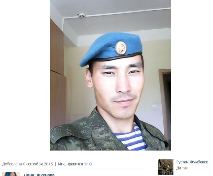 "Россия заявляет о нарушении норм международного права и о "ноже в спину" в контексте сбитого Турцией Су-24, одновременно предпочитая "забыть", сколько раз сама РФ нарушала нормы этого права по отношению к Украине", - напоминает InformNapalm, передает Цензор.НЕТ.В этот раз в поле зрения расследователей попался "заблудившийся" солдат-контрактник Рустам Жумбаков (архив профиля, архив фотоальбома, архив контактов) из 247-ого десантно-штурмового полка (ДШП) из состава 7-й воздушно-десантной дивизии (ВДД) - в/ч 54801, место дислокации г. Ставрополь. Рустам родом с Омска, новый 3 годичный военный контракт подписал в 2013 году, а до конца 2012 года служил в другом подразделении, в структурах МВД РФ.