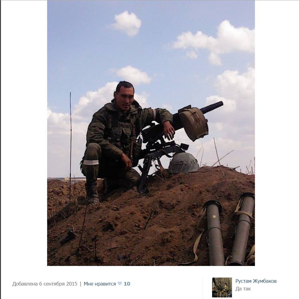 2. Еще одно фото (архив) Жумбакова загружено уже в сентябре 2015 года, где он также запечатлен в период боевых действий в Украине: позирует возле АГС, опять же отсутствие шевронов ВС РФ, но присутствуют те же белые опознавательные повязки.
