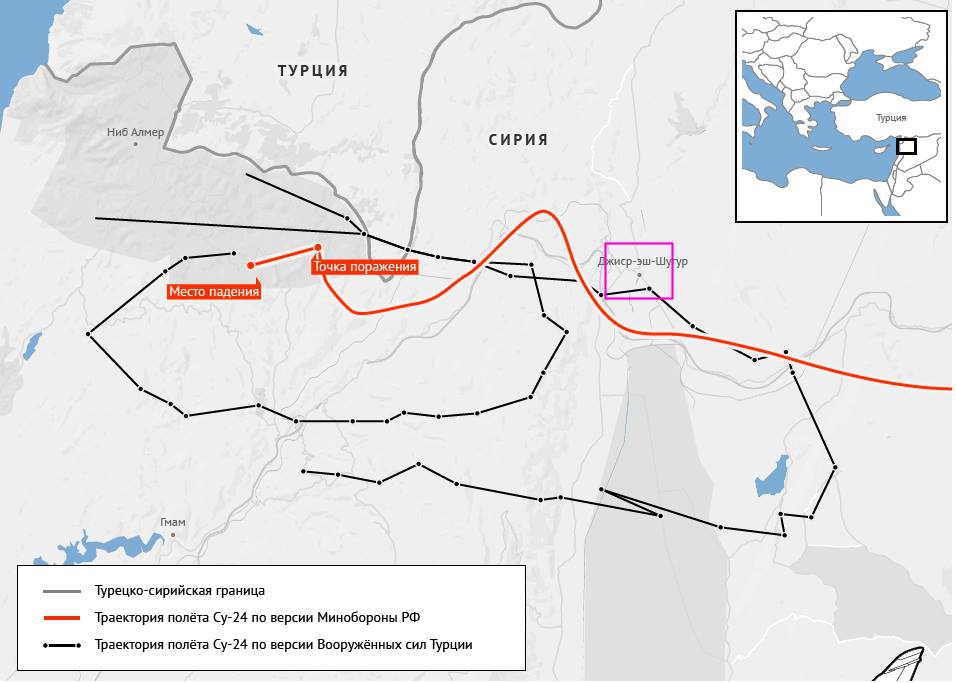 "Су-24 ВКС РФ сбитый 24 ноября истребителем ВВС Турции судя по схеме полетов Мин. обороны РФ и ВС Турции пролетал в районе города Jisr Al Shoughour, провинция Idlib. По заявлению службы гражданской обороны Сирии (белые каски, аналог МЧС) утром 24 ноября российский самолет нанес бомбовый удар по городу Jisr Al Shoughour, в результате пострадала местная школа, семеро детей были ранены.