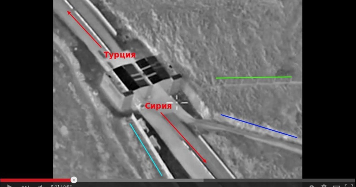 - Если же проанализировать кадры на хронометраже 00:08 - 00:12, видно, что машины только въезжают на территорию КПП Сирии - координаты точки на карте 36.232480, 36.685395.