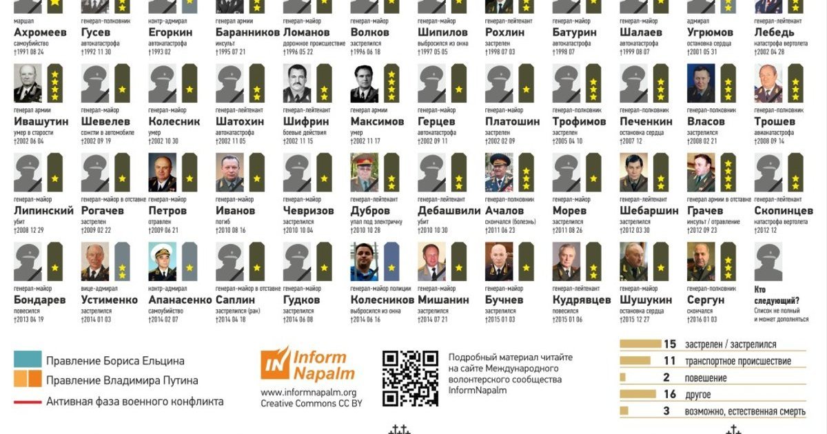 Об этом говорится в статье международного сообщества InformNapalm, авторы которой постарались составить наиболее полный список самых загадочных и чуть менее загадочных смертей генералов и адмиралов, которыми пестрит новейшая история России, передает Цензор.НЕТ."Обстоятельства смерти этих людей во многих случаях так и остались до конца не выясненными, тайны похоронены. Предоставим читателям право самим решать, что из этого было несчастным случаем, что - убийством, что - суицидом, а что - обычной смертью от старости или болезни. Также мы составили инфографику смертей российских генералов, на шкале которой выделили две эпохи правления российских президентов", - говорится в материале.