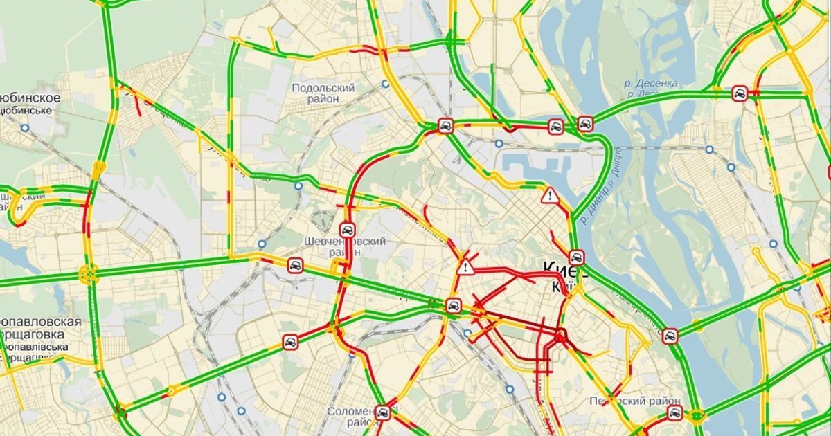 ДТП произошло на просп. Бажана, просп. Ватутина, Набережном шоссе, просп. Комарова, ул. Дегтяревской около станции метро "Берестейская", бульв. Дружбы Народов, ул. Телигы, ул. Саксаганского, ул. Деловой, просп. Победы около станции метро "Святошин", ул. Льва Толстого, просп. Московском.