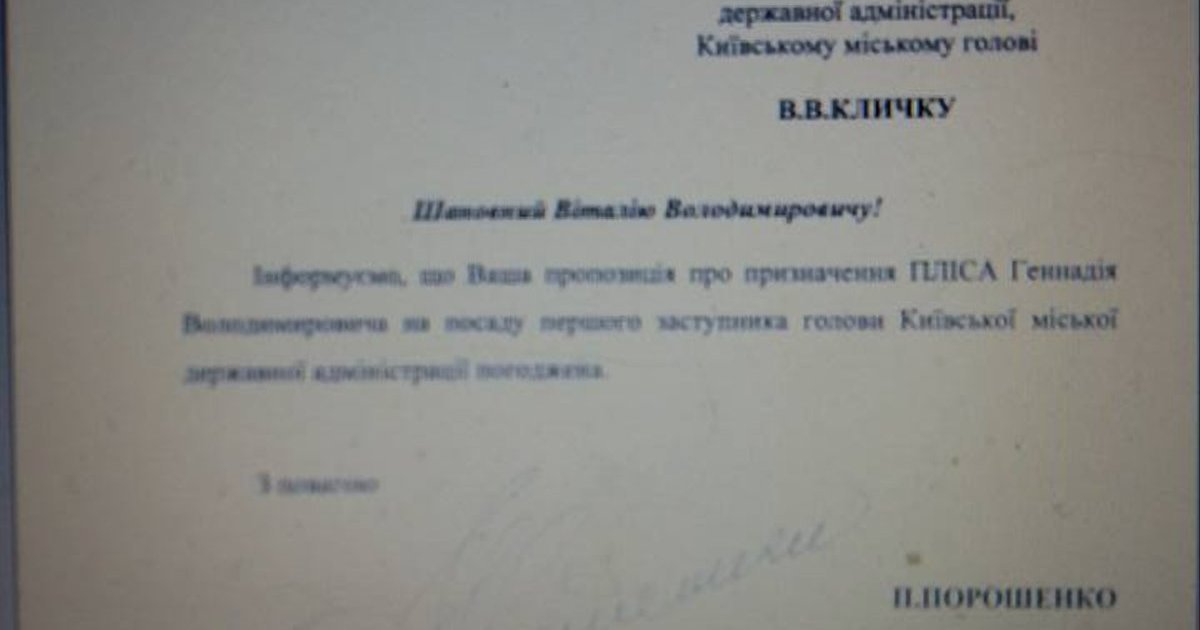 Руководитель аппарата КГГА Владимир Бондаренко опубликовал документ, подписанный Президентом Украины, в котором говорится о том, что кандидатура Плиса Геннадия согласована на должность первого заместителя председателя КГГА.