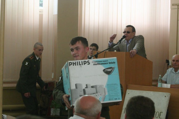 Июнь 2004 г., Петербург. Рома Цепов в родном Военно-политическом училище внутренних войск МВД. Жест благотворительности - дарит курсантам телевизор и домашний кинотеатр.