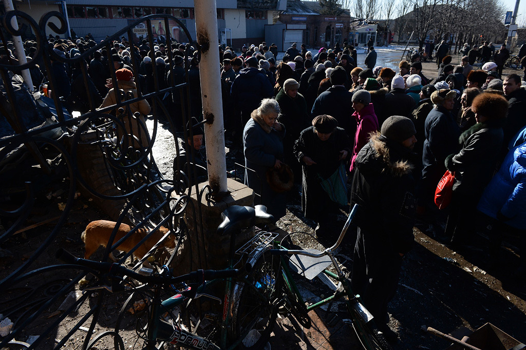22 февраля. Уже по короткому пути через Углегорск снова приезжаем в Дебальцево. Стрельбы уже не слышно, длинные очереди стоят за гуманитаркой. А еще какой-то месяц с небольшим назад в городе работали магазины и была почти что мирная жизнь.