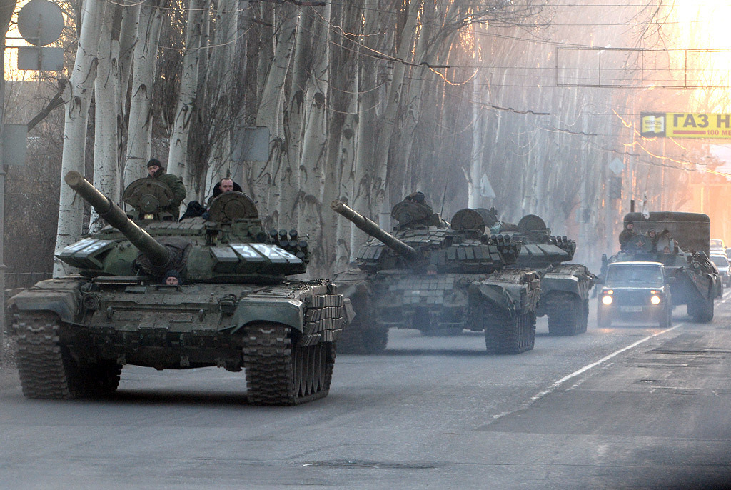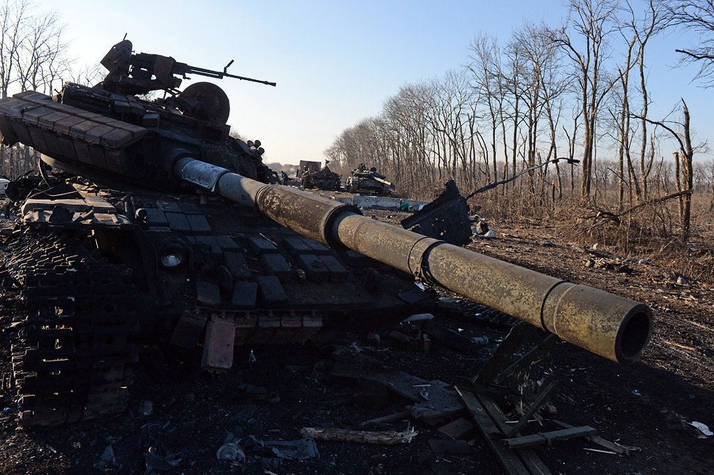 20 февраля. Через Снежное и Красный Луч попадаем, наконец, в Дебальцево.. Заезжаем с северной стороны. Знаменитый блокпост "Крест" забит вооруженными людьми с белыми повязками, бронетехникой. Прямо посередине перекрестка стоит брошенный танк. Неподалеку у обочины лежит труп, укрытый украинским флагом. Говорят, что это немецкий доброволец, который отстреливался еще час назад. Ветер приподнимает ткань флага, и становятся видны три пулевых в голову. Вообще, стрельба еще слышна, но скорее в отдалении, и значительно меньшей интенсивности, чем накануне.