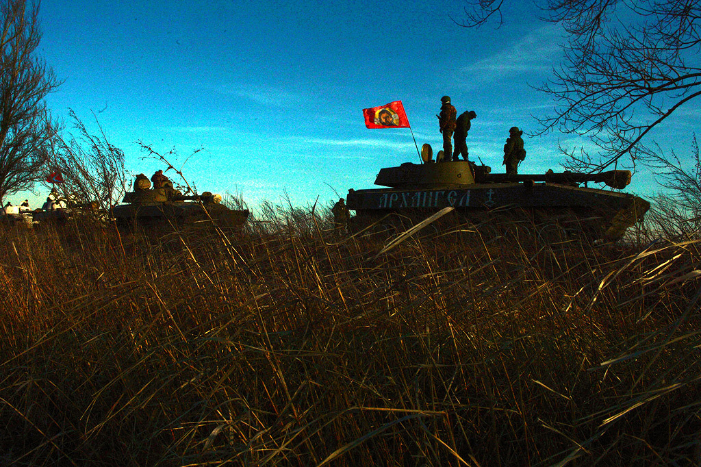 17 февраля. День выдался долгим. Поехали в Дебальцево через Луганск. Там пересели в камуфлированный внедорожник. Едем в Чернухино с вооруженными людьми. Заезжаем на базу неподалеку от линии фронта - бронетехника, вдоль обочин лежат трупы. Выходить из машины и даже снимать из окна нельзя. Понятно, почему - рядом навалены тела в характерной форме "Беркута", а рекламировать свои потери никто не хочет. Въехав в Чернухино, попадаем прямо в эпицентр боя, рядом с машиной рвутся ВОГи (гранаты из подствольников), и это неудивительно - тачка не выглядит гражданской. Прямо по газам назад, отъезжаем на километр. Решаем попробовать вернуться, и стать за подбитым танком, заслонившись от огня. У старшего срабатывает чуйка, он принимает решение остановиться чуть дальше - только мы вышли из машины, как поле возле танка расцвело прилетами града. Впрыгнули, и назад. Встретили группу на привале, только здесь и удалось сделать несколько кадров. Как вы догадываетесь, видимо, в Дебальцево мы так и не попали