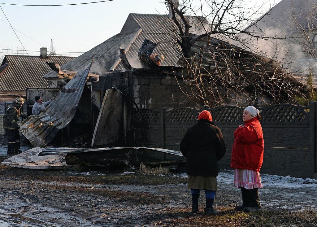 13 февраля. Прилетело по частному сектору на Куйбышевском, кажется районе. Повезло, все живы, хотя женщину в красной куртке трясло - это ее гараж горит на заднем плане. Несколько убитых собак. "Град" приземлился. Рядом горит завод. Как они там живут, я не понимаю - три улицы частных домов, с одной стороны гаубицы лупят, с другой танки
