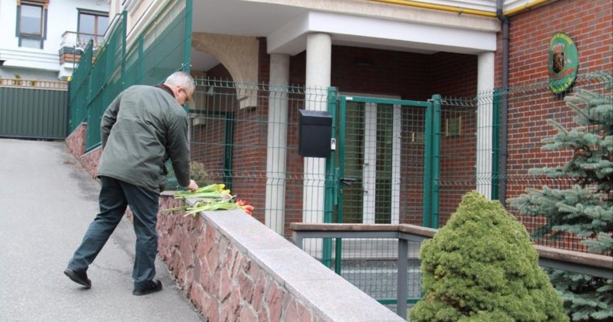 Украинцы сносят цветы под здание посольства Бельгии в Киеве по адресу ул. Николая Раевского, 4Б в знак солидарности с народом Бельгии.