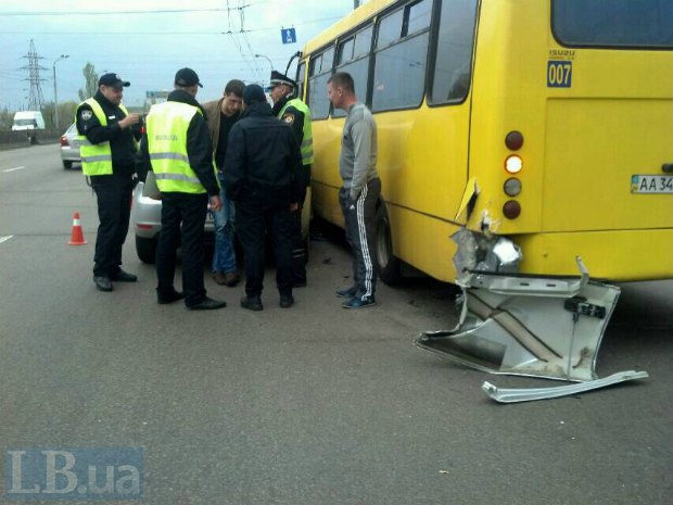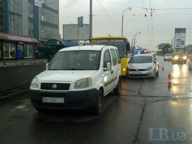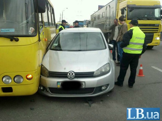 В субботу, 16 апреля, на проспекте Ватутина в Киеве автомобиль Volkswagen ударил попутный Fiat Doblo, после чего врезался в автобус "Богдан" на остановке.