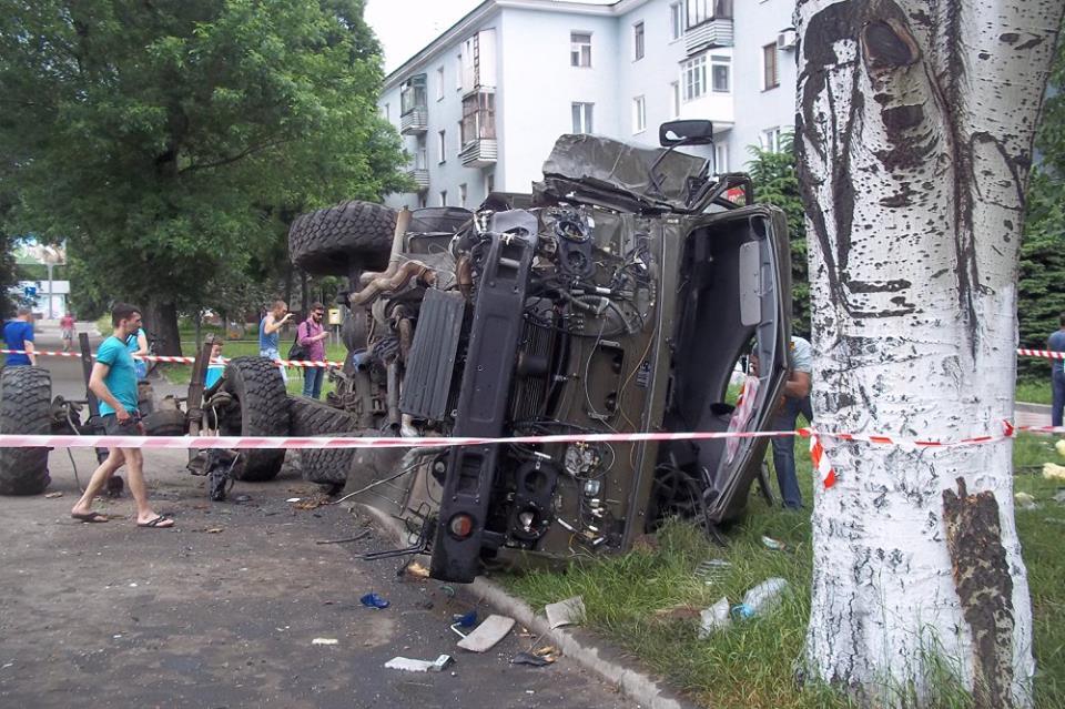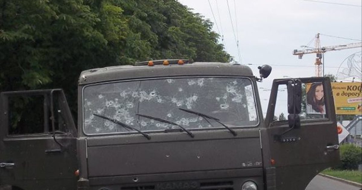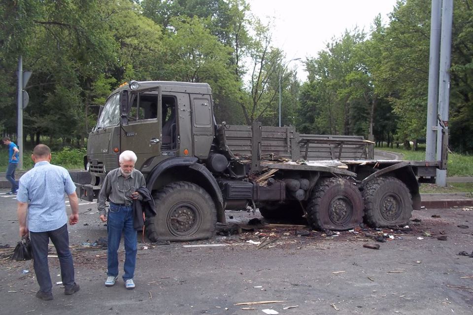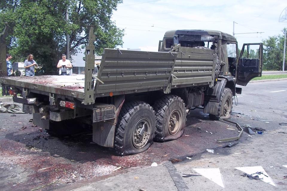 Фото с места обстрела "Камазов" выложил военнослужащий Игорь Победин (позывной - Курт) на своей странице в Facebook. По его словам, обстрел был совершен на Путиловском мосту Донецка.