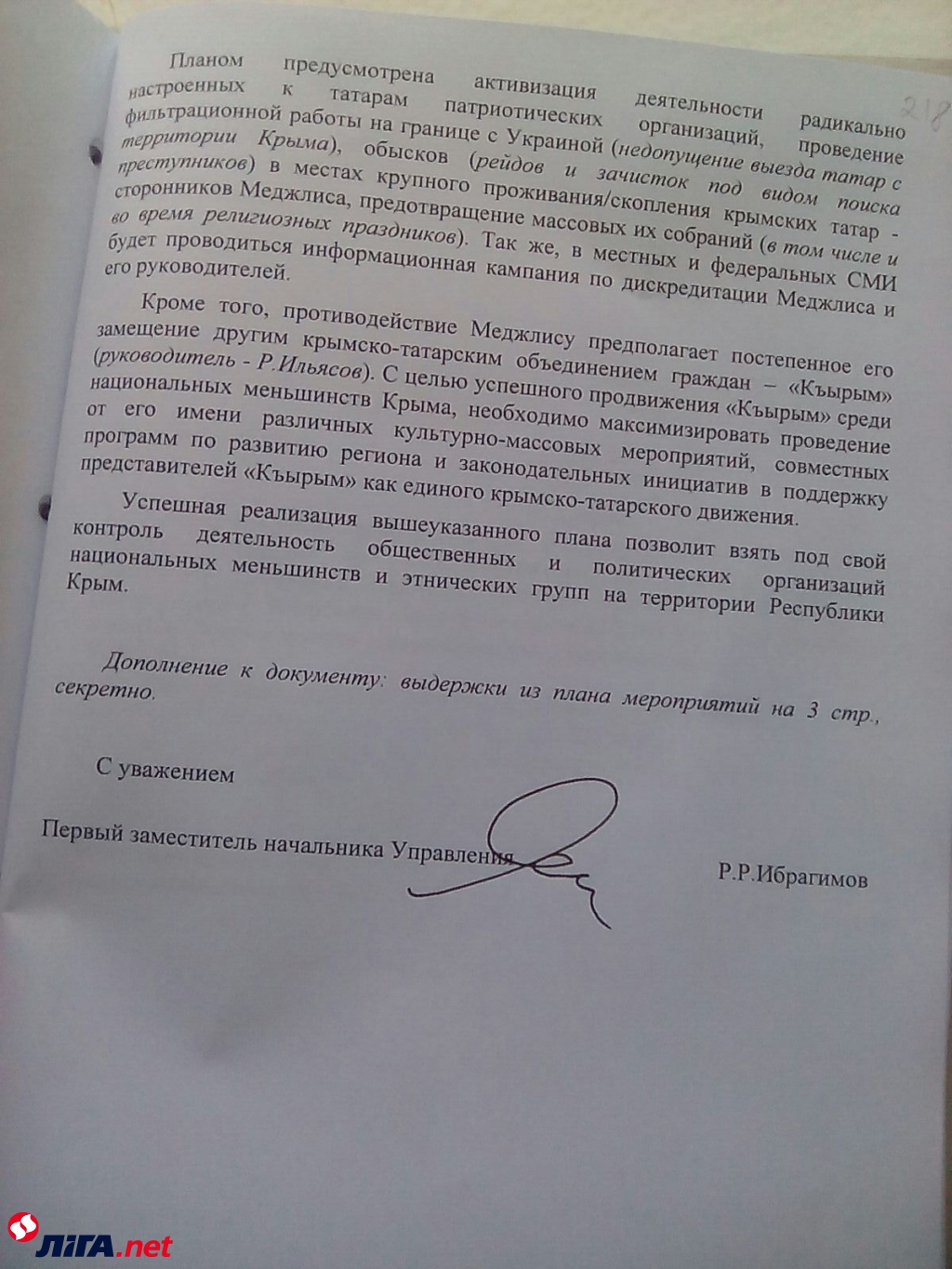 В документе, подписанном первым замначальника управления ФСБ по Крыму Рустемом Ибрагимовым, идет речь о некоем плане мероприятий, цель которых - "психоэмоциональное воздействие на местное руководство Меджлиса и склонение их к сотрудничеству с государственными органами".
