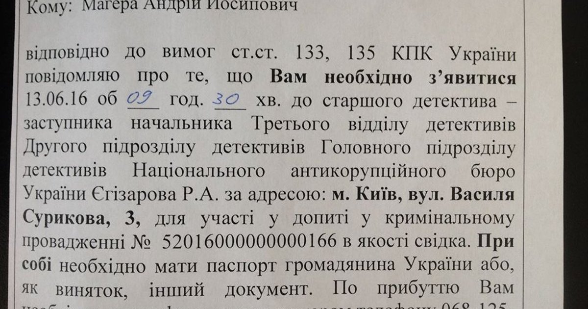 Об этом сам Магера сообщил на своей странице в соцсети Фейсбук, информирует Цензор.НЕТ."Похоже, НАБУ решило проверить подлинность "амбарной книги ПР". Фактически уголовное производство открыто по ст. 368 (принятие предложения, обещания или получения неправомерной выгоды должностным лицом) Уголовного кодекса. Не понимаю мою ценность как свидетеля по этому производству, но выполню требования закона и посещу НАБУ в понедельник, 13 июня", - сообщил он.