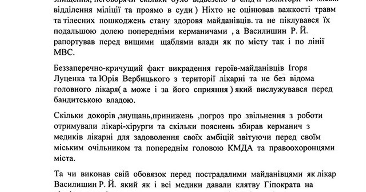 Но кадровом росту Василишина эти обращения не помешали. Как и не помешали финансовые проверки деятельности больницы под его руководством, которые, по имеющейся информации, обнаружили серьезные финансовые нарушения (кстати, сейчас стоит поднять акты этих проверок и оценить их через призму Уголовного кодекса). Видимо, у него есть влиятельный покровитель, который обеспечивал ему повышение по службе и прикрытие деятельности. Этот покровитель может способствовать и избежанию ответственности. Тем более, в ситуации, когда правоохранительные структуры вместо общего доказательства вины заняты выяснением отношений между собой", - заключает бывший зампред СБУ.