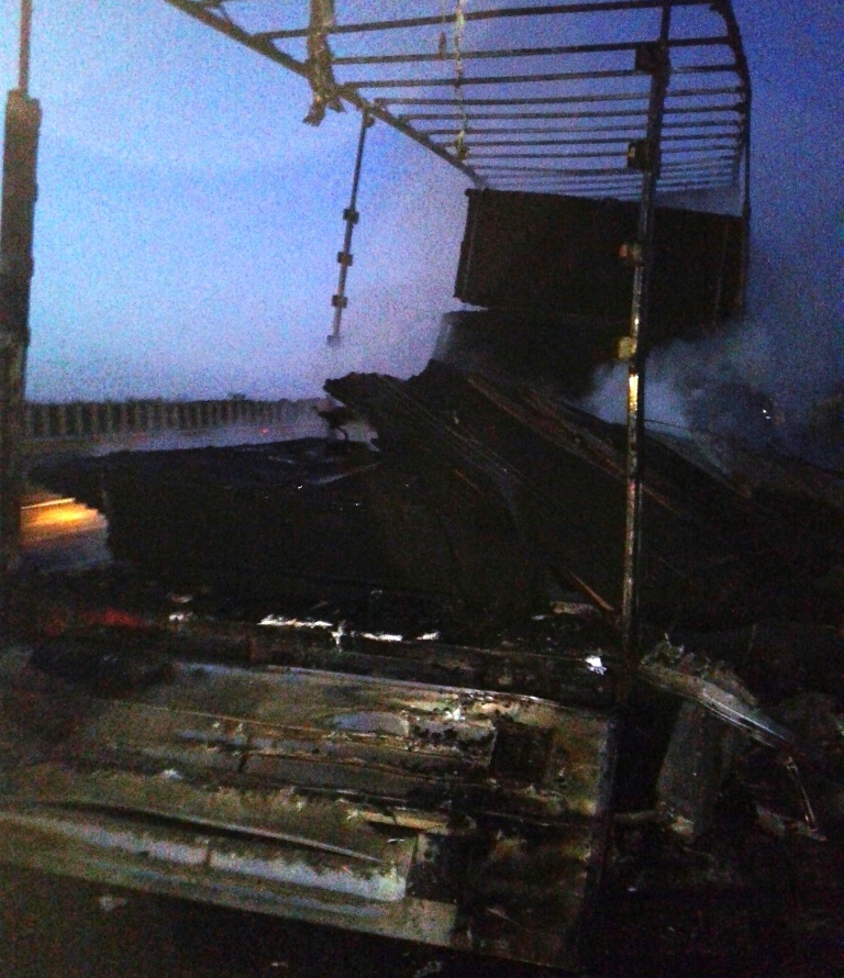 Огнем уничтожен полуприцеп и 22 тонны древесностружечных плит, которые находились внутри. По предварительным данным, причиной пожара стало заклинивание тормозной системы.