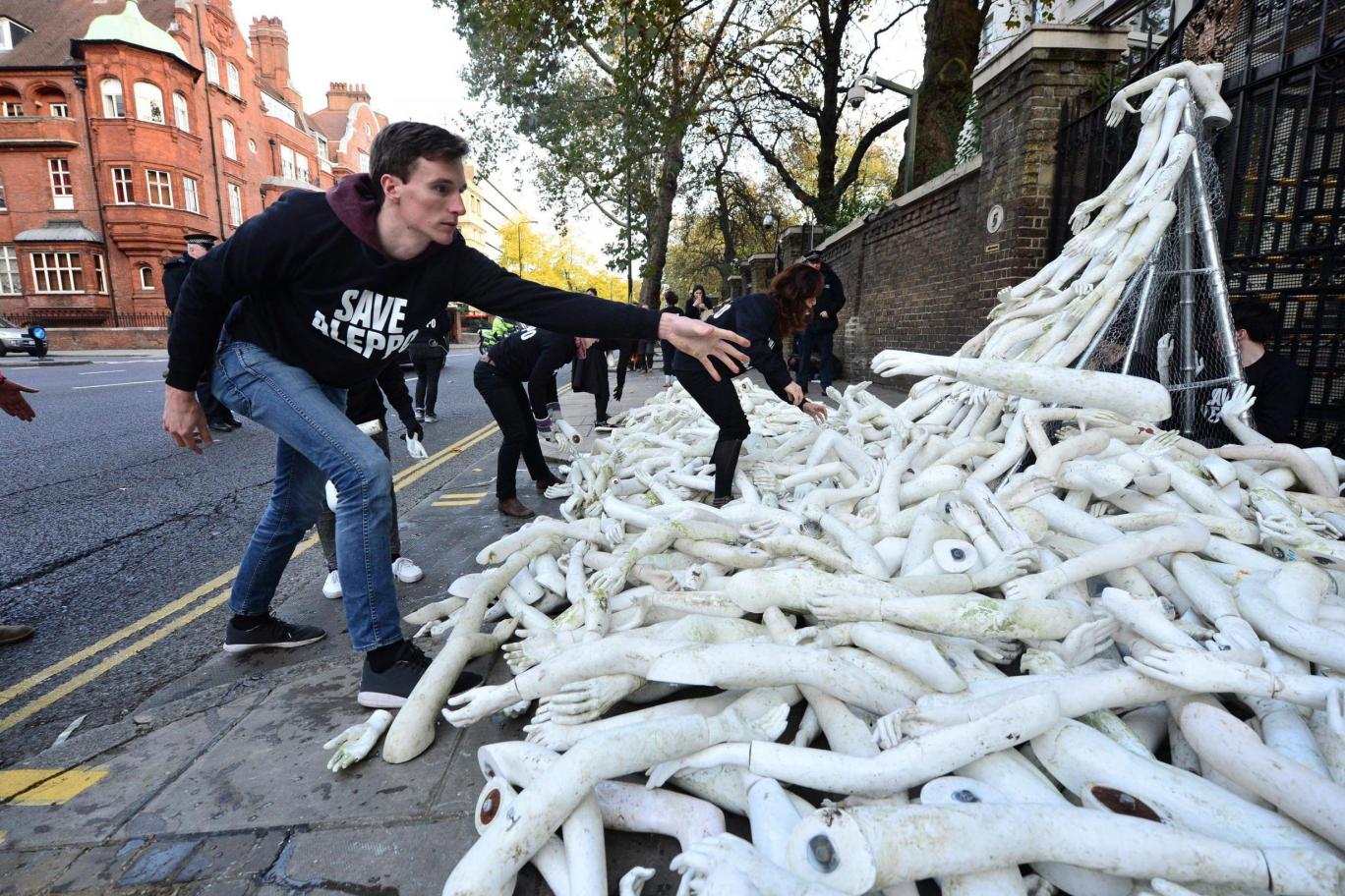Активисты двух кампаний - "Сирийская кампания" и "Солидарность с Сирией в Великобритании" забросали территорию перед российским посольством пластиковыми конечностями с манекенов взрослых и детей.