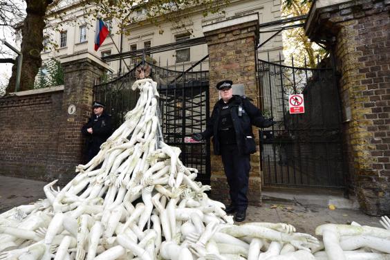 Посольство России в Лондоне забросали пластиковыми макетами человеческих костей, протестуя против бомбардировок Алеппо армией РФ. ФОТО