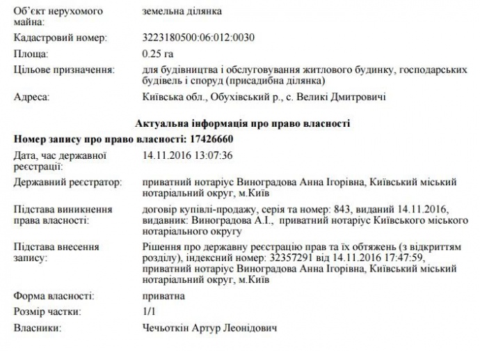 Соответствующая информация опубликована в Едином государственном реестре деклараций, передает Цензор.НЕТ со ссылкой на Украинскую правду.По данным реестра недвижимости, 14 ноября Артур Чечеткин приобрел 0,25 га земли в селе Великие Дмитровичи Киевской области. Ранее владельцем этого участка был Сергей Власенко.