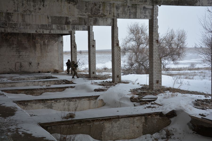 Следующим этапом тактических учений стала отработка действий подразделения при сигнале "Засада". То есть быстрое спешивание, тактическое передвижение на пересеченной местности с ведением штурмовых действий в определенном направлении. Десантники обнаружили "вражеские" позиции в остатках здания и получили приказ занять и зачистить их.