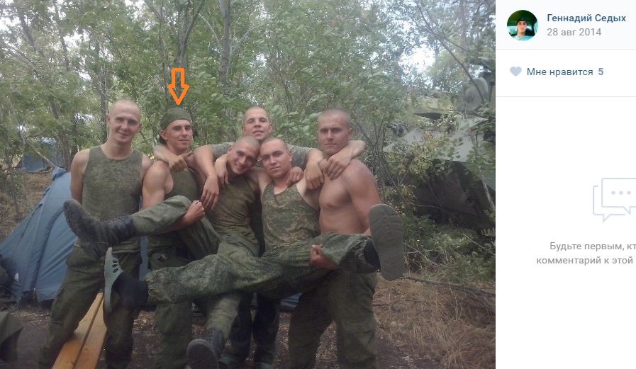 Среди фотографий Седых есть снимки из той же серии, что и у Моисеева - фотографии августа 2014 года, на которых группа военнослужащих роты РЭБ позирует в перевалочном лагере интервентов (выделен оранжевой стрелкой).