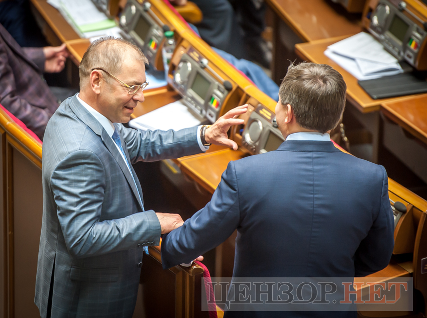 Сергей Власенко ("Батькивщина") призадумался, беседуя с коллегой Виктором Пинзеником (БПП).