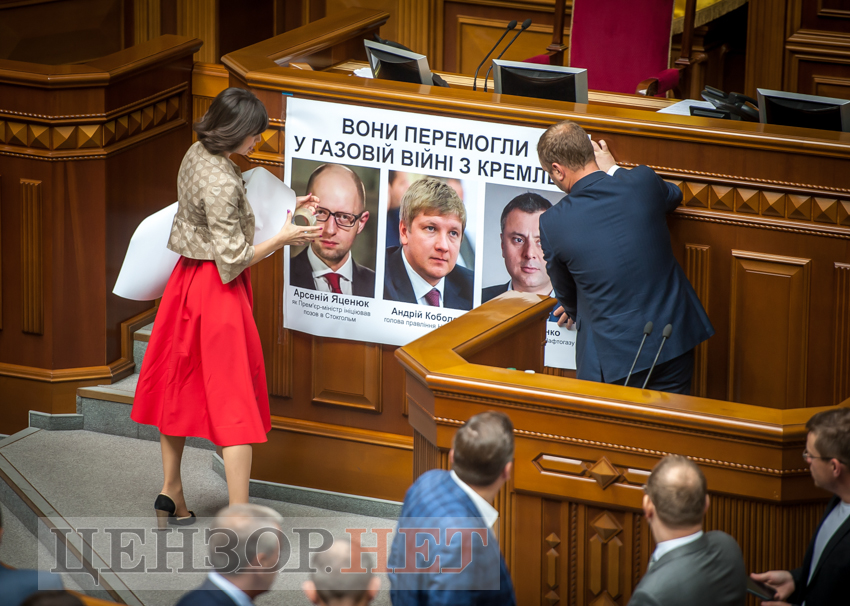 Нардепы от НФ, в частности Татьяна Чорновол, развешивают плакаты на президиуме Верховной Рады.