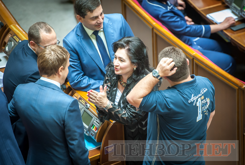 Матиос общается с коллегами Евгением Геллером (справа, в футболке), Хомутынником (по центру, напротив Матиос), Павлом Пинзеником (слева за Хомутынником) и Дмитрием Лубинцом (БПП).