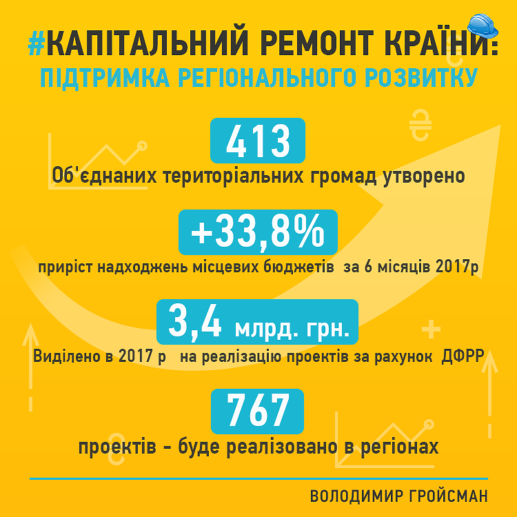 "Кроме средств в местных бюджетах, которые каждая община распределяет по своему усмотрению, правительство финансирует ряд проектов Государственного фонда регионального развития. В этом году из ГФРР выделено 3,4 млрд гривен на реализацию 767 проектов", - информирует глава правительства.
