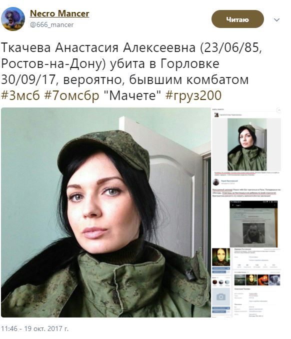 Об этом в своем аккаунте в Твиттере пишет блогер Necro Mancer, передает Цензор.НЕТ."Ткачева Анастасия Алексеевна (23/06/85, Ростов-на-Дону) убита в Горловке 30/09/17, вероятно, бывшим комбатом 3мсб 7омсбр Мачете. Груз 200", - рассказал он и опубликовал фото наемницы РФ и скрины ее страницы в соцсетях.