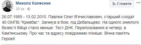 Об этом на своей странице в Фейсбуке сообщил депутат городского совета Кривого Рога от партии "УКРОП", волонтер Николай Колесник, передает Цензор.НЕТ."26.07.1989 - 13.02.2015. Павлюк Олег Вячеславович, старший солдат 40-й ОМПБ "Кривбасс". Погиб в бою под Дебальцево. На одного пропавшего без вести воина стало меньше. Тест ДНК. Перезахоронение в четверг, в Каменском. О времени и адрес сообщим позже. Вечная память Герою!", - сообщил Колесник.