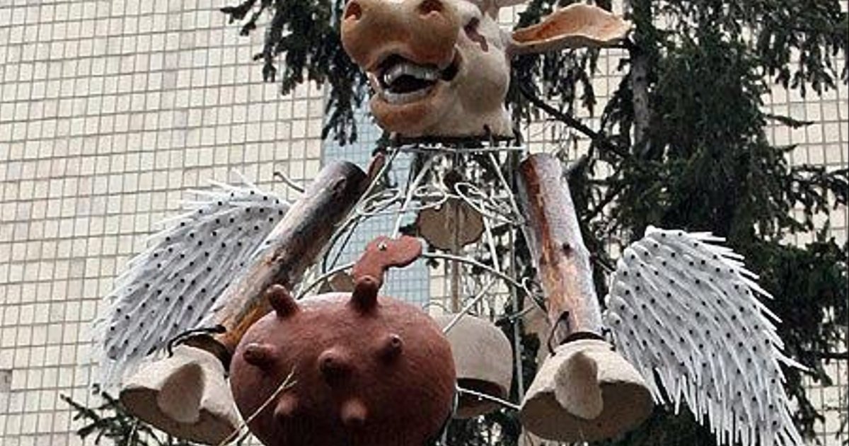 Еще один забавный памятник появился в Киеве в субботу. На улице Олеся Гончара скульптор Константин Скретуцкий установил давно обещанную Летающую корову.