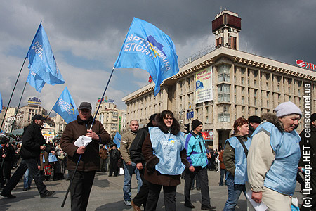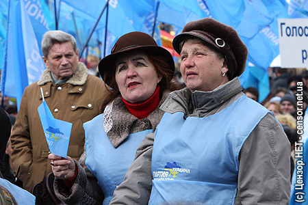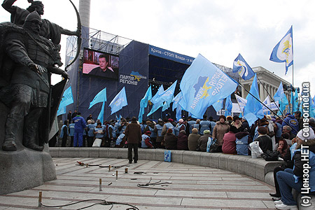 Митингующие начали собираться с 10 утра. Организаторы выстроили прибывших в колонны и повели под трибуну, возведенную возле памятника Независимости. Там митингующим показали фильм о Викторе Януковиче. Сам лидер ПР опоздал на час, и собравшиеся депутаты-регионалы "тусили" за сценой.