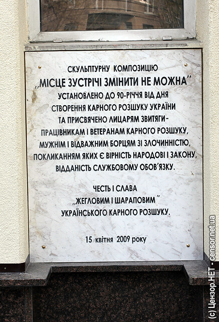 Сегодня в Киеве возле здания Министерства внутренних дел Украины в честь 90-летия создания уголовного розыска открыта бронзовая скульптурная композиция «Место встречи изменить нельзя».