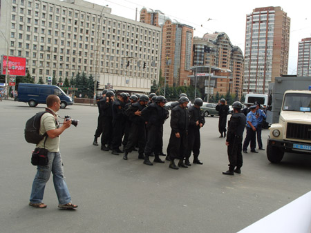 В 10.30 выйдя на улицу, они перекрыли движение на 1 час, чтобы привлечь внимание к своей проблеме. Сначала милиция, а затем курсанты в черной форме со шлемами разогнали людей, восстановив движение.