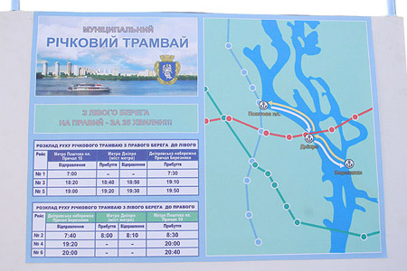 В частности, утром речной трамвай будет отправляться по маршруту: в 7:00 от причала N10 (станция метро "Почтовая площадь", Речной вокзал) до станции "Березняки" (причал возле моста им. Патона), в 7:40 - от станции "Берзняки" до "Моста Метро", от "Моста Метро" до "Почтовой площади". Вечером в 18:00 и в 19:00 он будет курсировать по маршруту "Почтовая площадь", причал N10 - "Мост Метро" - станция "Березняки". В 19:20 и в 20:00 - по маршруту "Березняки" - "Почтовая площадь".