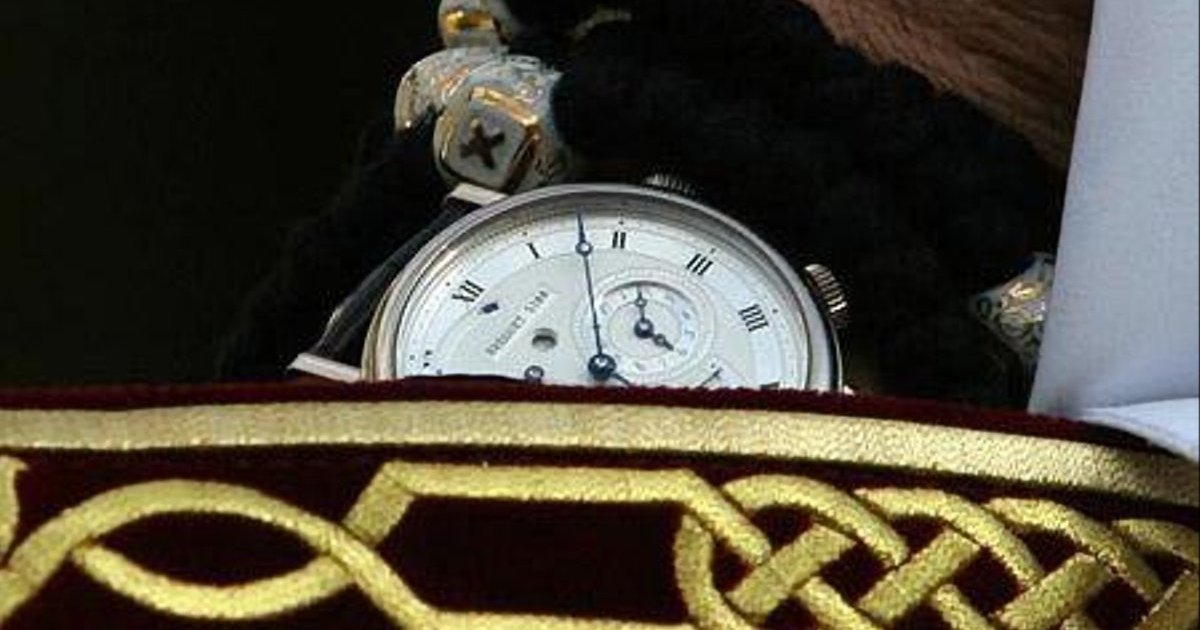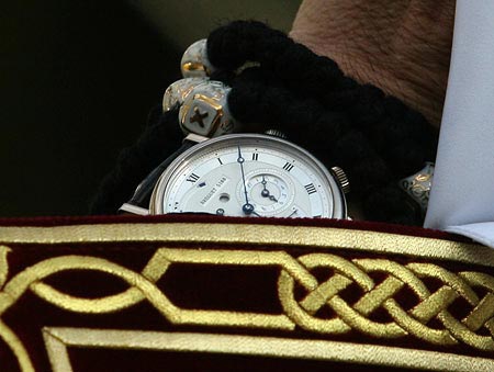 Во время молебна на Владимирской горке в Киеве фотографы запечатлели на запястье патриарха Кирилла часы фирмы Breguet.