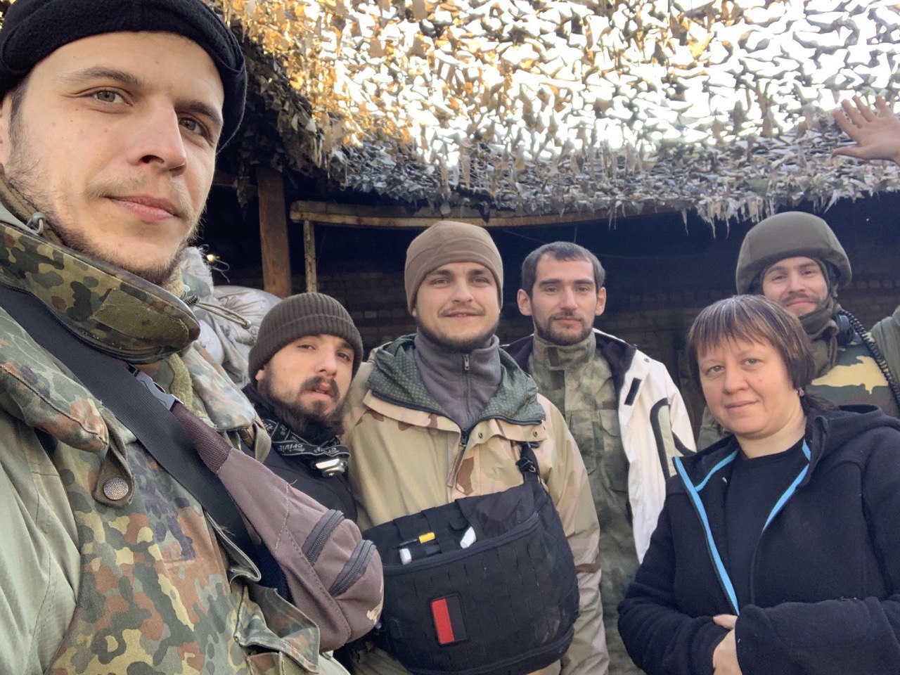 Єдина жінка на знімку – Ганна Корницька, медик, яка чергує на передовій. Крайній зліва режисер фільму "Евакуація" Євген Тітаренко, біля нього оператор Олексій Степанков-Ткаченко