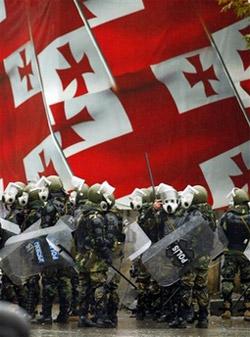 Отношения между Москвой и Тбилиси стали напряженными с того момента, как в 2003 году Саакашвили пришел к власти в результате так называемой "революции роз" и начал неуклонно уводить Грузию, бывшую советскую республику, из зоны российского влияния и все больше приближать ее к Соединенным Штатам и НАТО. Правительство впервые применило силу против митинга протеста. Полиция, оснащенная всем необходимым для подавления восстания, избивала манифестантов дубинками, применяла слезоточивый газ и водометы для разгона толпы, требовавшей проведения досрочных выборов на проспекте Руставели перед зданием парламента. Применялись и резиновые пути: 360 манифестантов обратились за медицинской помощью, 109 оставлены в больницах для лечения.