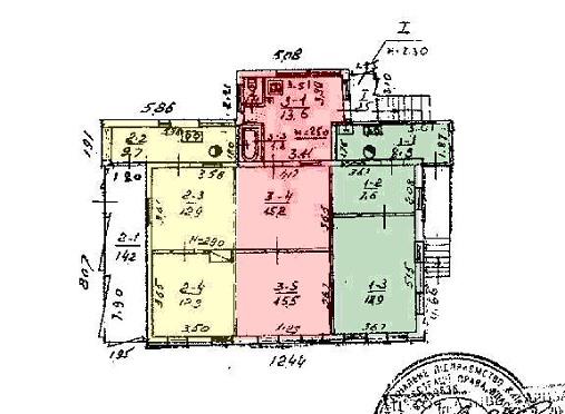 Червоним кольором позначена частина будинку, що належить Ніні Москаленко - це дві суміжні кімнатки «паровозіком» всередині будинку, причому одна з кімнат, позначена на плані цифрами 3-4 - без вікон.