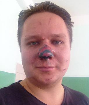 Пішов за ними у кімнату охорони. Весь у крові, носа не відчуваю. Охоронець каже: "Парень, честно говорю - п...да твоему носу". Зайшов в туалет, дивлюся в дзеркало - плачевно. Тут могла б бути красива фотка, але у стані шоку та стресу, коли реально боїшся, що ніс відпаде, якось не спадає на думку за*башити лук. Тому є фото, яке я зробив лише наступного ранку - зі швами, після повторної обробки та заклеювання ран солкосерилом.
