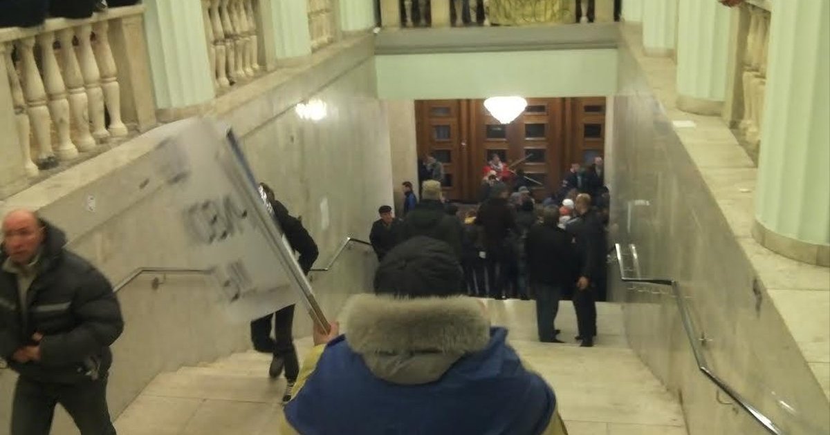 Взагалі все відбулося так. Пробили вікно, зайшли в перше приміщення Київради. Це було приміщення охорони, і наша атака саме туди була психологічним тиском. Фактично ми звалилися їм на голову, бо застрибнули до хлопців у формі через перегородку.