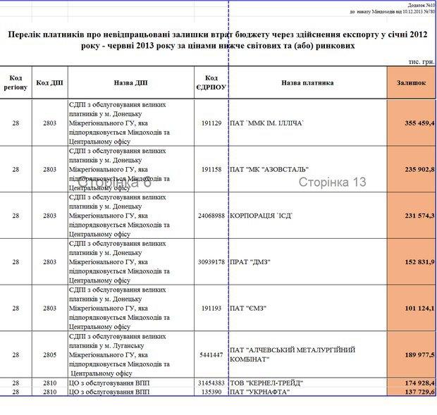 І нічого страшного не було б у цих орієнтирах, якби відомство Клименка не взяло їх за основу для формування «чорного списку». У додатках 10, 28.1 та 28.2 є перелік підприємств, з якими працюватиме податкова на предмет заниження митної вартості. Переважно це середній та дрібний бізнес. Та є і великі підприємства, які, за даними Клименка, недоплатили у бюджет понад 100 тисяч гривень лише за перше півріччя 2013 року. Найцікавіше, що майже всі ці великі «оптимізатори», серед яких корпорація «ІСД» та ПАТ «Укрнафта», - з Донецька.