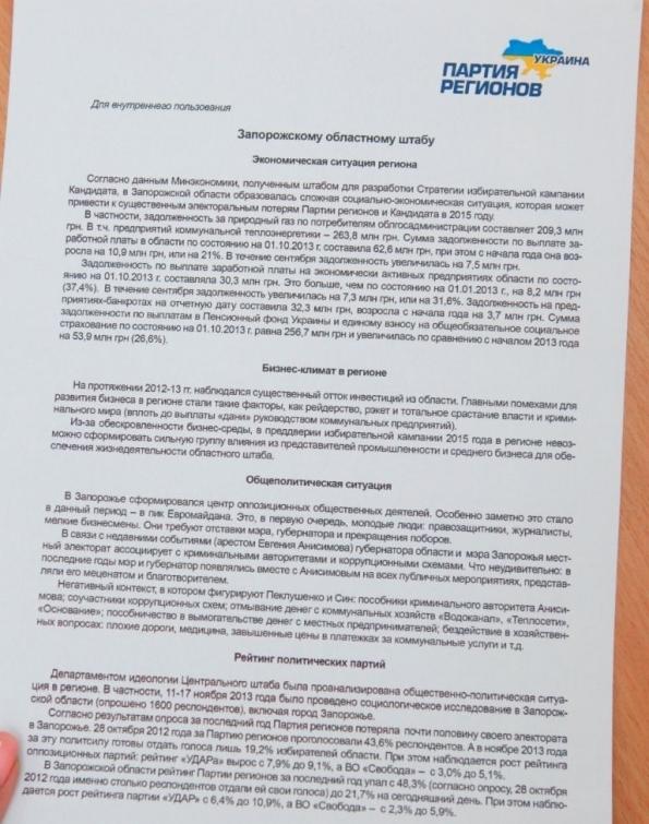 Есть и более свежие данные, которые вселяют нам еще больший оптимизм. Это письмо в Запорожский областной штаб Партии регионов, не предназначавшееся для публикации, но просочившееся в прессу. В нем приведены данные социологического опроса в ноябре 2013 года, который партия проводила в области для анализа текущей политической ситуации. Грубо говоря, не для пиара, а для понимания реального положения вещей. Не доверять ему нет оснований.