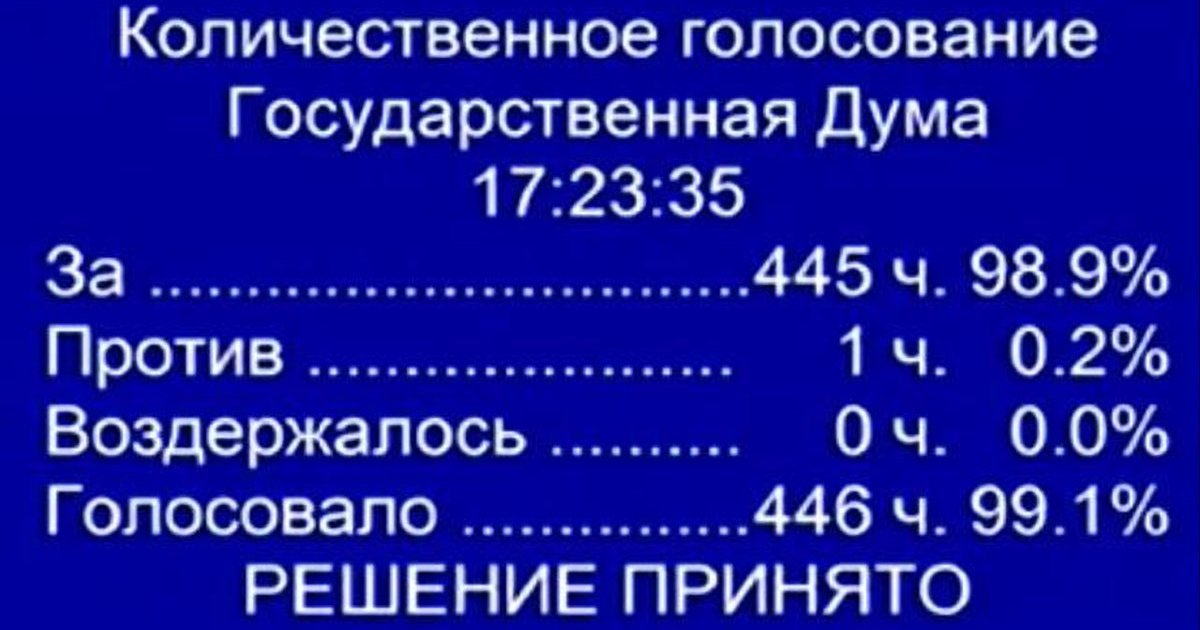 Итоги голосования о присоединении Крыма: за - 445, воздержались - 0, против - 1. Я. Не голосовало четверо. Поясню свою позицию, пишет в своем ЖЖ депутат Госдумы РФ Илья Пономарев.