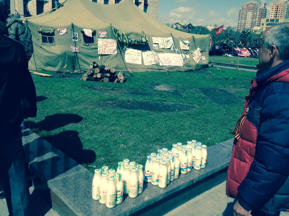 Сочувствующее население приносит в лагерь еду. Из специальной палатки разносят бутерброды с вареной колбасой. Беру один на пробу. Вкус такой же, как на Майдане. А вот молоко в стеклянных бутылках в киевский ассортимент, кажется, не входило. Ну, так и погода в то время была - не сравнить с нынешней...