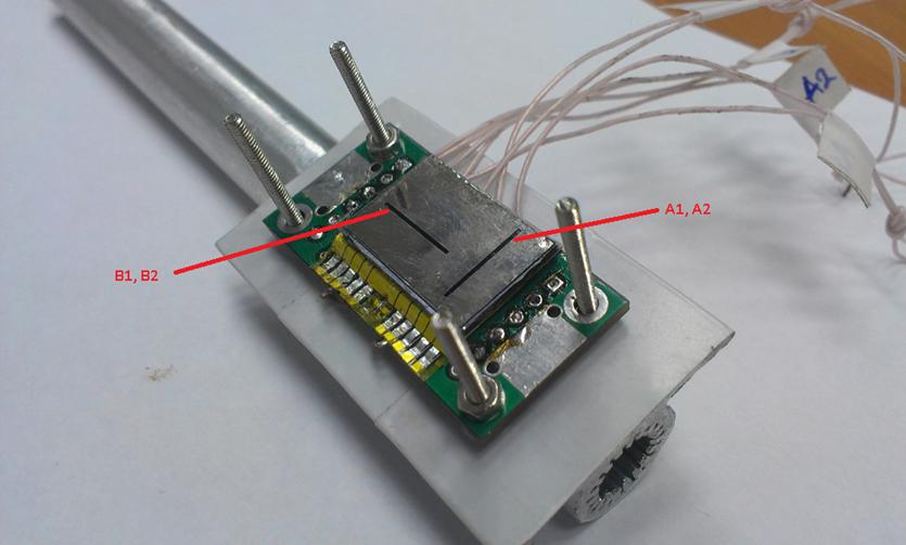 Датчик направления на Солнце. Разработкой и изготовлением занимались у нас в КПИ. Если в двух словах описывать устройство датчика, то это маленькая солнечная батарея с четырьмя участками съема тока, накрытая непрозрачной панелью с двумя взаимно перпендикулярными прорезями. Выходы от фотоэлемента идут на микросхему для усиления сигнала, который в дальнейшем можно измерить АЦП на плате БВК. После обработки снятых данных можно получить вектор, указывающий на Солнце.